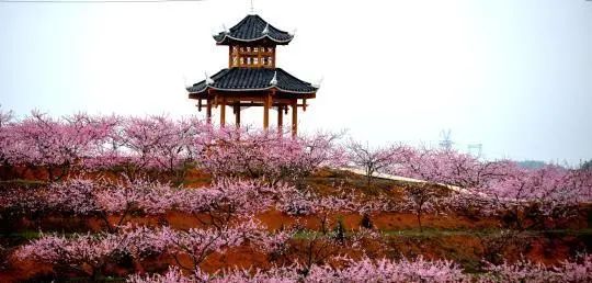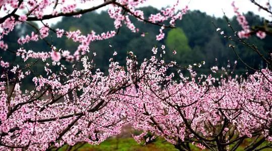 산기슭에 서서 바라보니 산과 들에 가득한 복숭아나무의 꽃들이