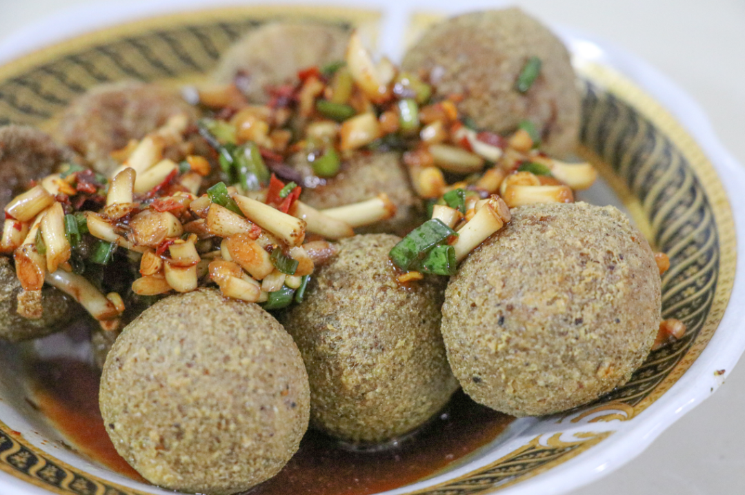 한에 먹기좋을만한 크기로 방금 튀겨낸 두부완자는 고소하고 바삭바삭하며 현지에서 먹는 방법은 젓가락으로 찔러 벌려서 어성초 양념장을 가득 채워서 먹습니다. 만약 비린내 나는 어성초가를 못먹으면 고춧가루 양념을 찍어 드셔도 좋습니다.