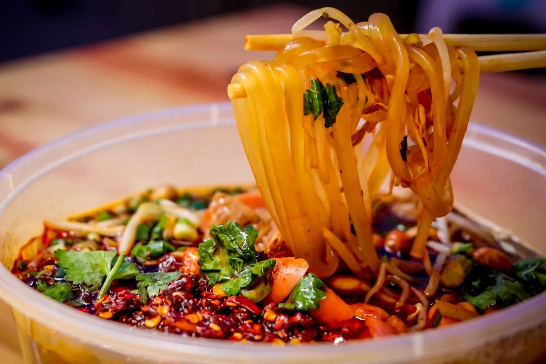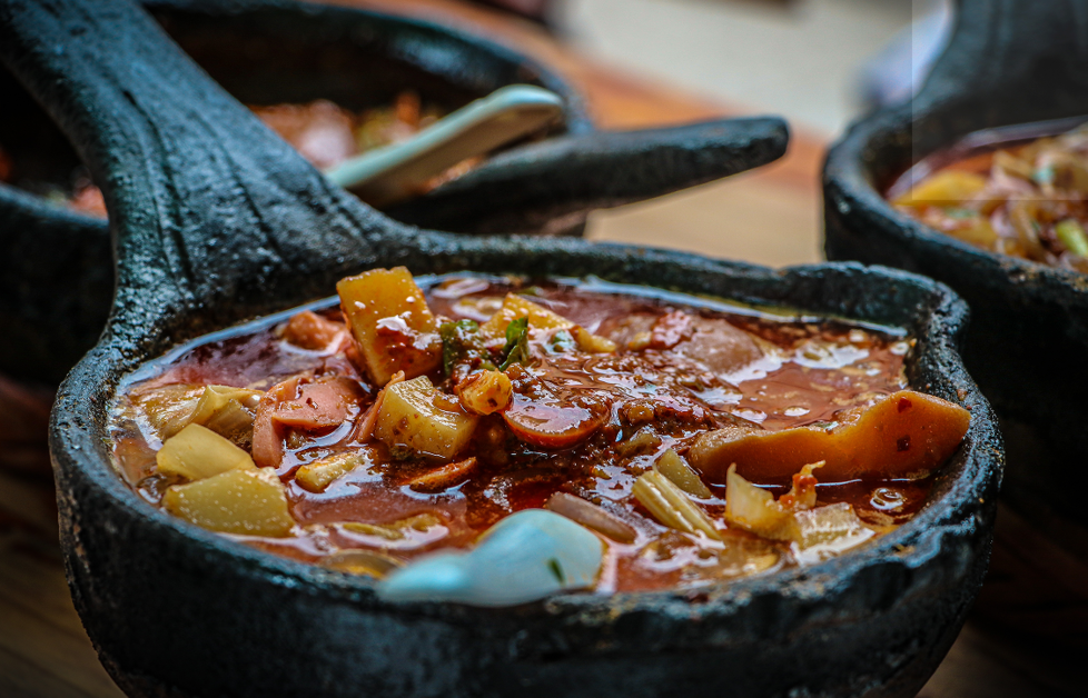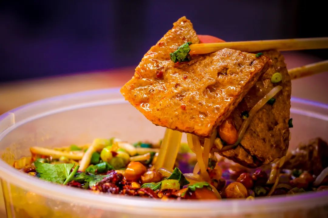 네모나게 썬 쌀두부, 햄, 토란 등 여러 가지 반찬을 냄비에 넣고 푹 고으며 고추, 다진 마늘, 파, 산초, 다진 생강으로 만든 소스, 걸쭉한 콩국이 량펀에 스며들어 입맛이 짙고 간이 적당합니다.